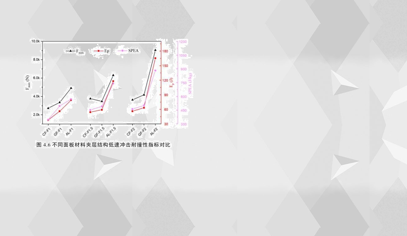 為了更為直觀地比較不同面板材料的夾層結(jié)構(gòu)的抗沖擊性能,圖4.6比較了相同面板厚度但面板材料不同的夾層結(jié)構(gòu)的耐撞性指標(biāo),通過(guò)比較可以看出,鋁合金夾層結(jié)構(gòu)有最優(yōu)的耐撞性能,其臨界穿透能高達(dá)118J,初始峰值載荷高達(dá)6297N;而碳纖維增強(qiáng)夾層結(jié)構(gòu)的耐沖擊性能明顯低于鋁合金夾層結(jié)構(gòu)的,其臨界穿透能和初始峰值載荷分別為54J和3752N;而與碳纖維增強(qiáng)夾層結(jié)構(gòu)相比,玻璃纖維的耐碰撞性略有提高,其臨界穿透能為59J。此外,根據(jù)三者完全穿透試件的載荷-位移在第一階段的斜率可以看出,如圖4.5(d),鋁合金夾層結(jié)構(gòu)的斜率最大,也就是說(shuō),在低速?zèng)_擊工況下,鋁合金夾層結(jié)構(gòu)的剛度大于纖維增強(qiáng)夾層結(jié)構(gòu)的剛度。通過(guò)觀察面板厚度為1mm和2mm試件的耐撞性指標(biāo),也可以知道,在低速?zèng)_擊工況下,鋁合金夾層結(jié)構(gòu)有最好的耐撞性能,而碳纖維夾層結(jié)構(gòu)的耐撞性能在三者幾乎是最差的。